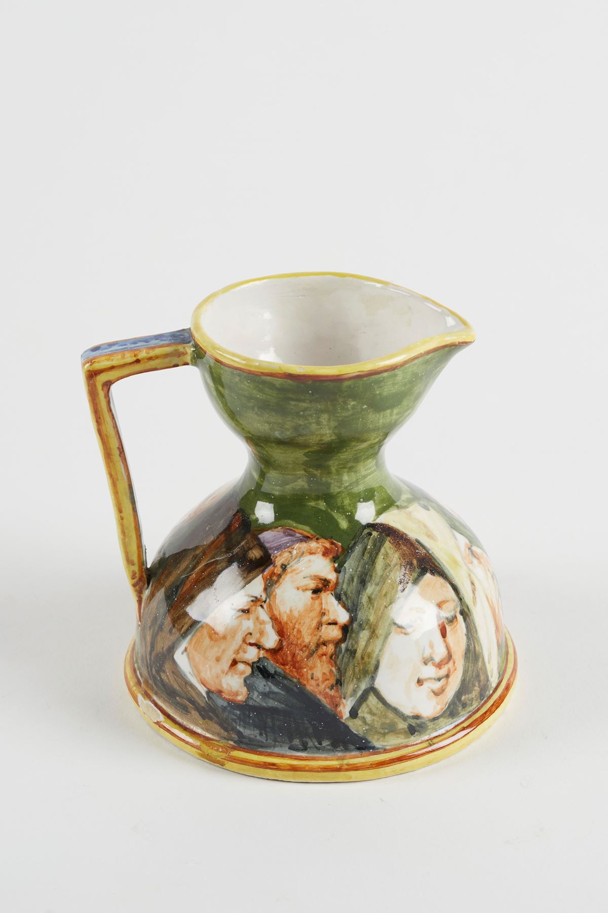 • Lot n° 0032 Versatoio con figure - MANIFATTURA MINGHETTI Versatoio in ceramica policroma, decorato con figure di frati e suore. XX secolo. Cm 11x11x10. Al retro reca marchio AM. (lievi difetti) - Cm 11x11x10 -