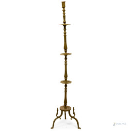 Candeliere in ottone cesellato, poggiante su tre gambe arcuate, XX secolo, altezza cm 153, (difetti)