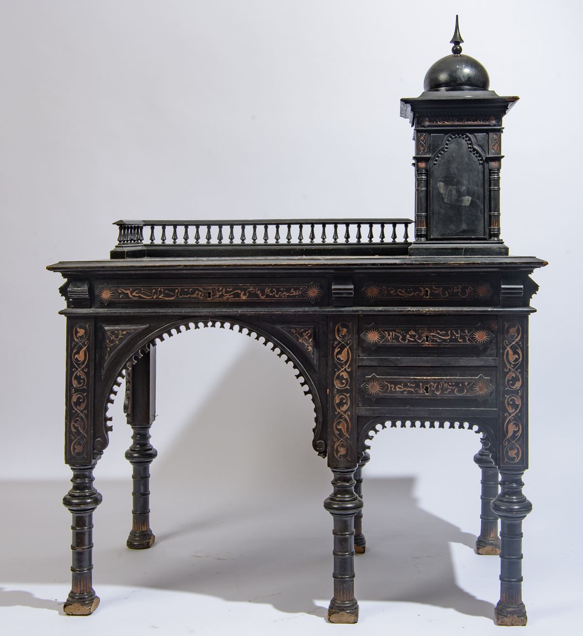 Scrivania - Con alzata laterale e cupola. Intagli e scritte in arabo perimetrali e a contrasto - 145 x 115 x 65 cm - legno ebanizzato