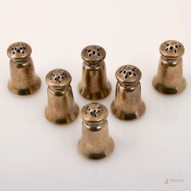 Lotto composto da 6 sale e pepe in argento, Inghilterra, XX secolo, altezza cm 4,5, peso totale gr. 70
