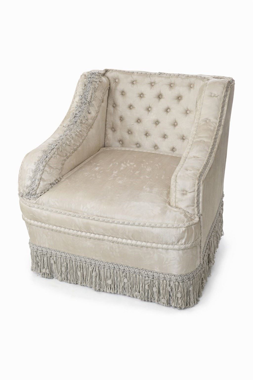 Poltrona in seta chiara - difetti e usure. I lotti oggetto della presente asta sono ubicati presso un’abitazione privata sita in Roma.La partecipazione all’asta implica la piena accettazione della condizione secondo cui il ritiro dei beni aggiudicati sarà interamente a cura, rischio e spese dell’aggiudicatario.Resta inteso che eventuali operazioni di smontaggio, imballaggio, trasporto e ritiro dovranno essere organizzate direttamente dall’aggiudicatario.Si raccomanda pertanto di richiedere preventivamente tutte le informazioni necessarie, anche al fine di acquisire eventuali preventivi per il trasporto prima di formulare un’offerta. - 80 x 75 x 90 cm -