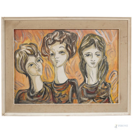Tre figure femminili, XX secolo, olio su tela, cm 50x70, firmato in basso a destra, entro cornice