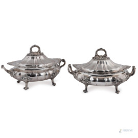 Coppia di legumiere con coperchio in Sheffield finemente cesellato, XX secolo, cm 30x40x25