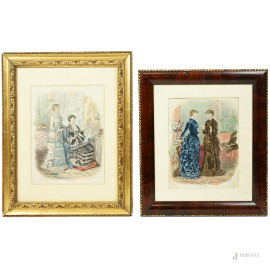 • Lot n° 0593 Coppia di stampe colorate su carta raffiguranti dame, misure massime cm 39,5x29 compreso passepartout, entro cornice