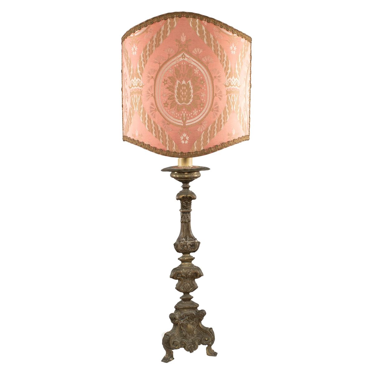 Torciere elettrificato in metallo - base a tripode sagomata, decori a motivi di volute, completo di paralume in tessuto, usure e difetti - h. 80 cm. - h. totale 120 cm. -