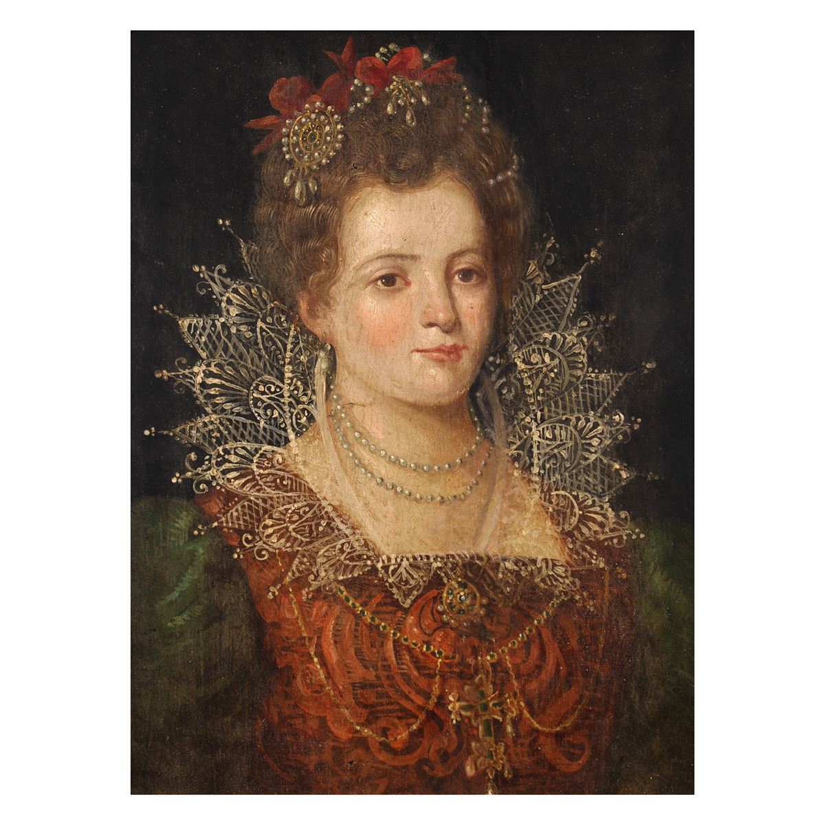 • Lot n° 0069 Pittore fiammingo - "Ritratto di Barbara Sofia di Brandeburgo", olio su tavola, entro cornice in legno intagliato e dorato - 39x28,5cm. -