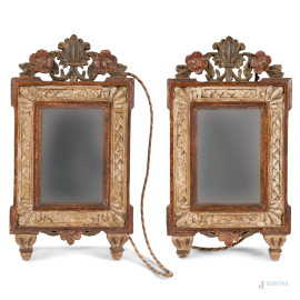 • Lot n° 0312 Coppia di specchierine in legno intagliato, dorato e dipinto, XX secolo, cm 47x25,5, (segni di usura, scalfiture, difetti)