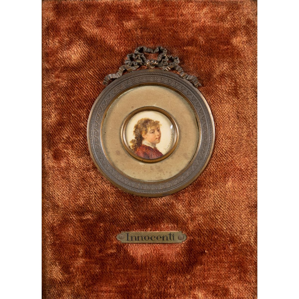 Camillo Innocenti - "Ritratto di giovane", olio su carta, firmato in basso a destra, entro cornice - 3,3x3,3 cm. -