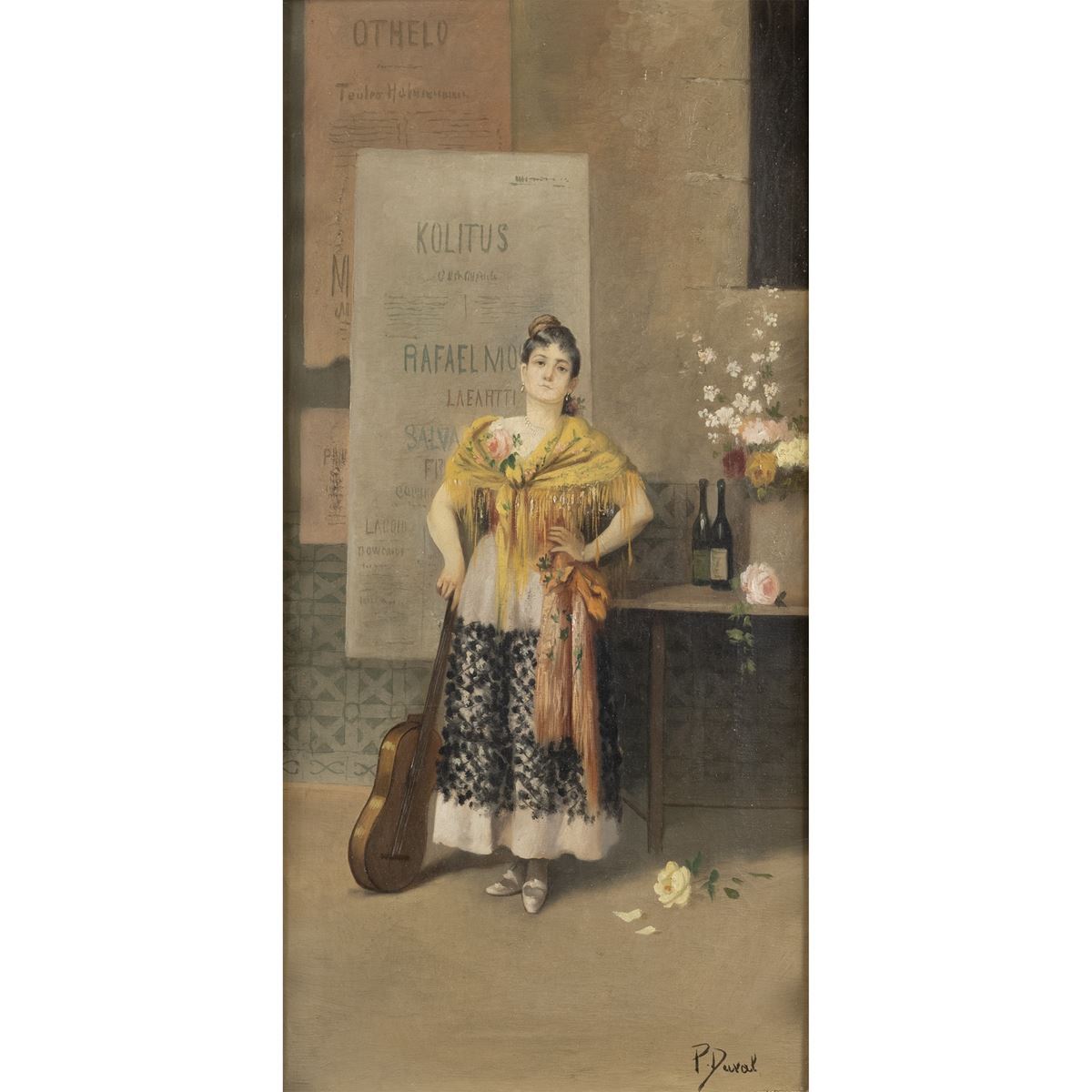 P. Duvall - "Gitana", olio su tela, firmato in basso a destra, entro cornice - 53x27 cm. -