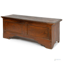 Cassapanca in noce modanato con piedi a mensola, XX secolo, cm 52x131x46,5, (segni di usura)