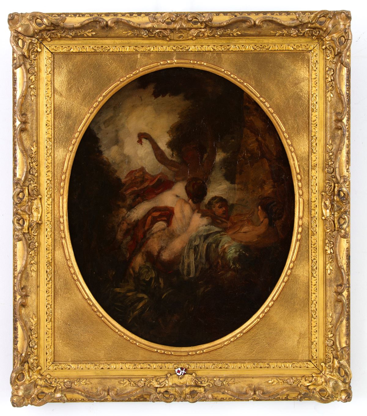 • Lot n° 0352 Dipinto "NINFE NEL BOSCO" - Dipinto olio su tela raffigurante "NINFE NEL BOSCO". Difetti e lievissimi restauri. - 69x55 cm ca. (cornice inclusa) -