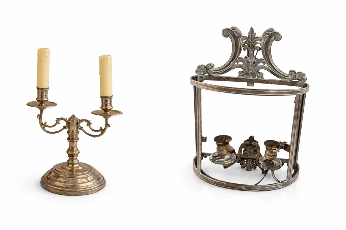 Miscellanea di lumi - Composto da: 2 candelieri in argento a due luci adattati a lampada (peso: 500 gr. netti)(h. 35 cm), 2 candelieri a una luce in argento (300 gr. ca netti), 4 appliques (h. 35 cm).I lotti oggetto della presente asta sono ubicati presso un’abitazione privata sita in Roma.La partecipazione all’asta implica la piena accettazione della condizione secondo cui il ritiro dei beni aggiudicati sarà interamente a cura, rischio e spese dell’aggiudicatario.Resta inteso che eventuali operazioni di smontaggio, imballaggio, trasporto e ritiro dovranno essere organizzate direttamente dall’aggiudicatario.Si raccomanda pertanto di richiedere preventivamente tutte le informazioni necessarie, anche al fine di acquisire eventuali preventivi per il trasporto prima di formulare un’offerta. - - metallo argentato