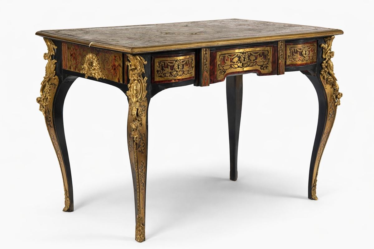Tavolo scrittoio in stile Boulle - Elegante scrittoio a tre cassetti in linea sul fronte, realizzato in legno ebanizzato con ricca decorazione a intarsio in ottone secondo il gusto Boulle.I quattro piedi, leggermente arcuati, sono ornati da applicazioni in bronzo dorato. Importanti restauri e mancanze. - 75 x 105 x 63 cm -