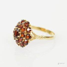 Anello in oro giallo 18 kt ornato "a fiore" con rubini, gr. 4,4