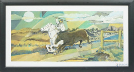 Cavalli di ispirazione cubista, olio su cartone, cm 25x50, firmato Nando Scardella, entro cornice.
