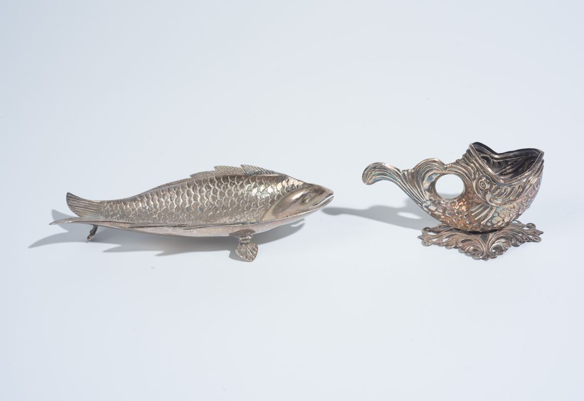 Due pesci in metallo argentato - I lotti oggetto della presente asta sono ubicati presso un’abitazione privata sita in Roma.La partecipazione all’asta implica la piena accettazione della condizione secondo cui il ritiro dei beni aggiudicati sarà interamente a cura, rischio e spese dell’aggiudicatario.Resta inteso che eventuali operazioni di smontaggio, imballaggio, trasporto e ritiro dovranno essere organizzate direttamente dall’aggiudicatario.Si raccomanda pertanto di richiedere preventivamente tutte le informazioni necessarie, anche al fine di acquisire eventuali preventivi per il trasporto prima di formulare un’offerta. - 16 x 14 cm; saliera: 5 x 5 x 9 cm -