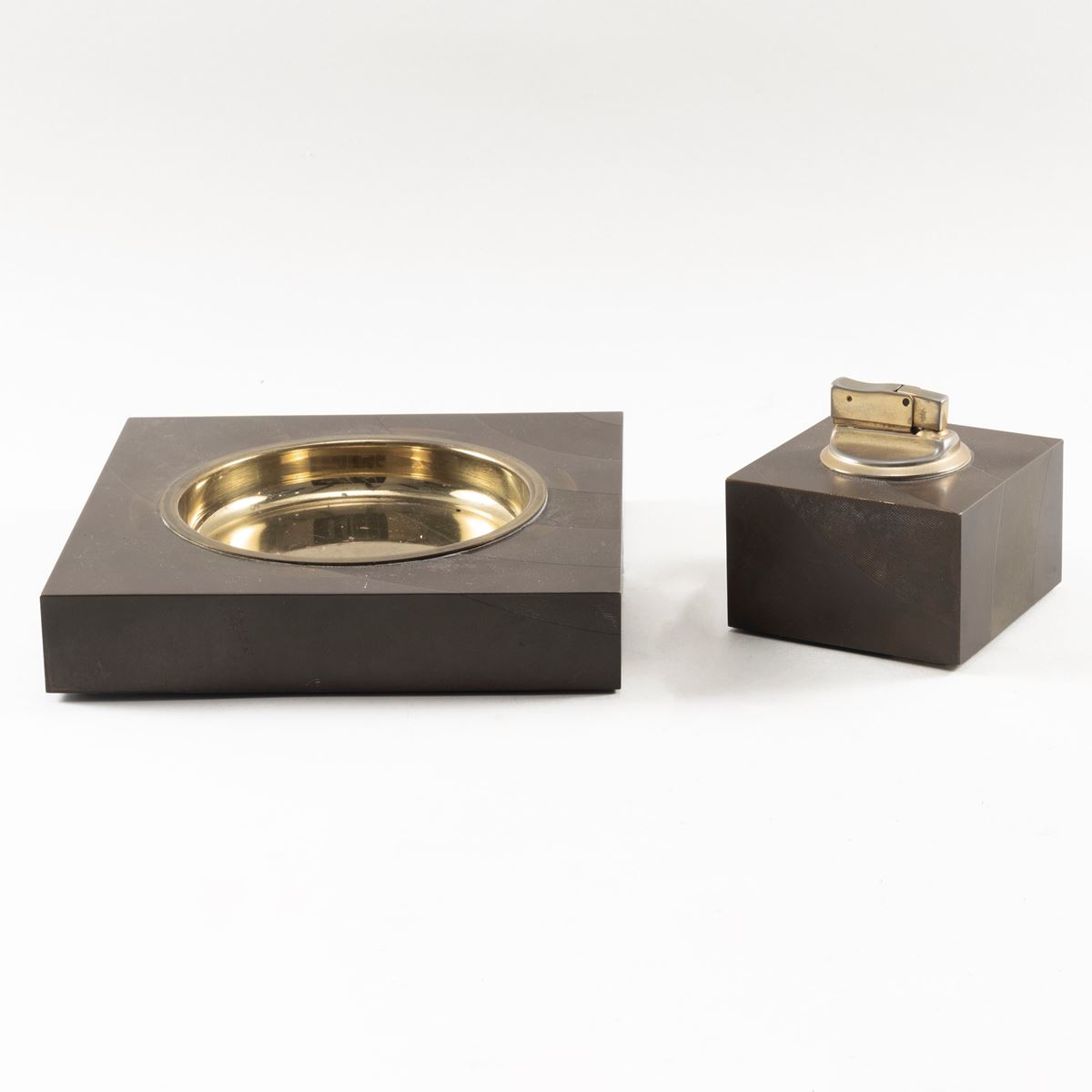 Manifattura italiana - set da fumo composto da accendino e posacenere in metallo ed ottone, lievi usure - misura massima 7x16x16 cm. -