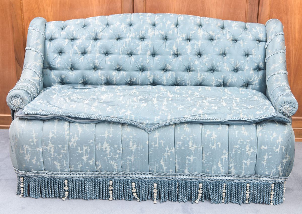 Divano in seta azzurra a due posti - I lotti oggetto della presente asta sono ubicati presso un’abitazione privata sita in Roma.La partecipazione all’asta implica la piena accettazione della condizione secondo cui il ritiro dei beni aggiudicati sarà interamente a cura, rischio e spese dell’aggiudicatario.Resta inteso che eventuali operazioni di smontaggio, imballaggio, trasporto e ritiro dovranno essere organizzate direttamente dall’aggiudicatario.Si raccomanda pertanto di richiedere preventivamente tutte le informazioni necessarie, anche al fine di acquisire eventuali preventivi per il trasporto prima di formulare un’offerta. - 85 x 140 x 70 cm -