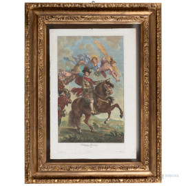 • Lot n° 0685 Incisione acquerellata raffigurante Filippo IV (da Velazquez), XVIII-XIX secolo, cm 71x47, entro cornice, (segni di piegatura, ondulazioni, foxing, piccole lacerazioni)