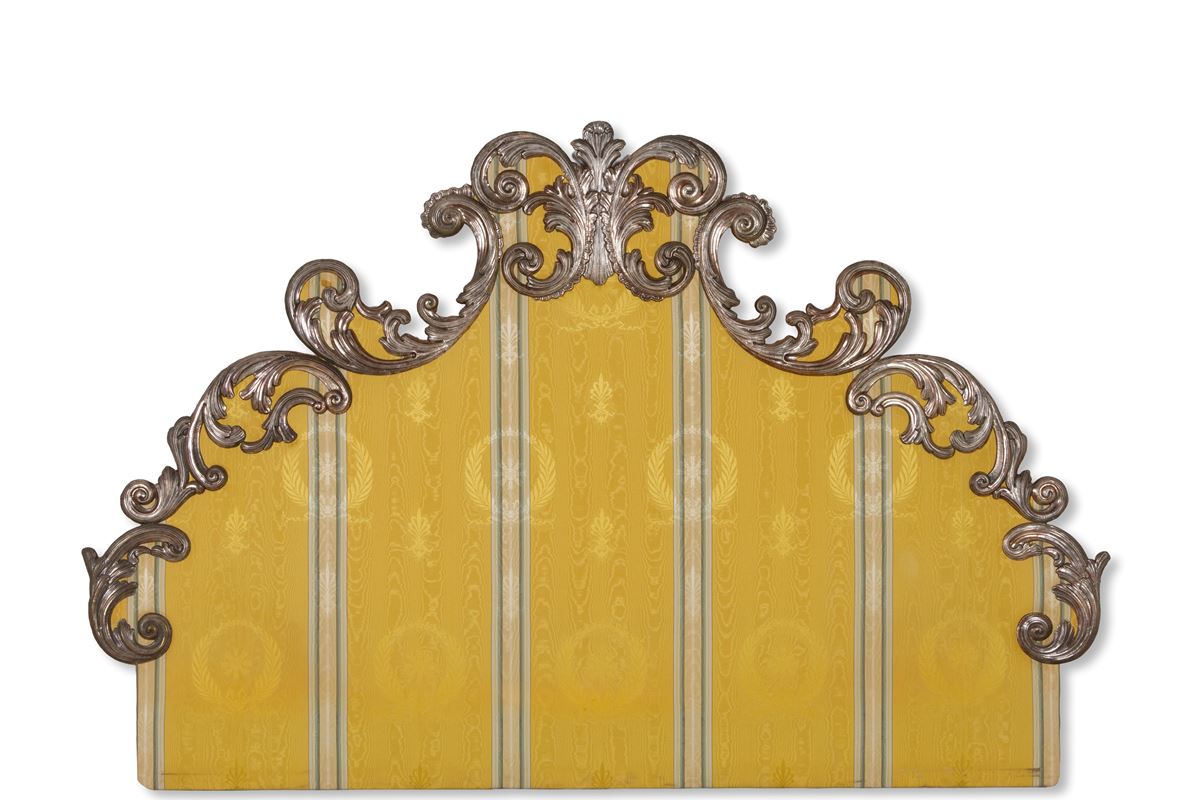 Testiera - Testiera da letto in legno imbottito con fregi in metallo sbalzato e argentato. Inizi XX secolo. - 131x201 cm ca. -