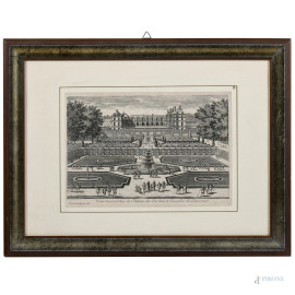 • Lot n° 0648 Nicolas de Poilly, acquaforte raffigurante Veduta dei giardini di Liancourt, cm 34x47 compreso passepartout, entro cornice