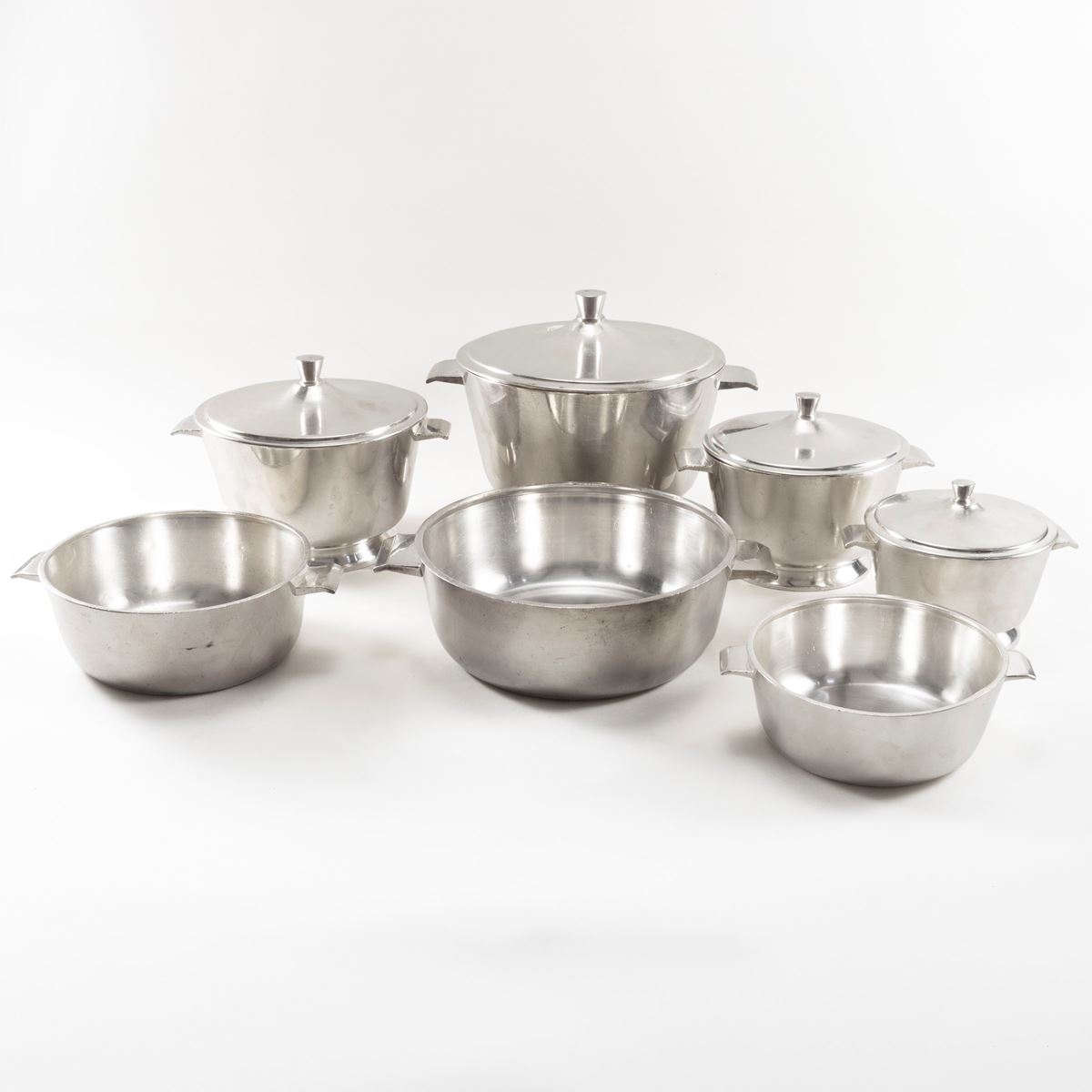 Prod. Broggi - set da tavola in alpacca, marchio della produzione, lievi usure e difetti, composto da:quattro zuppiere: misura massima 20x30 cm.tre legumiere: misura massima 8x30 cm. - -