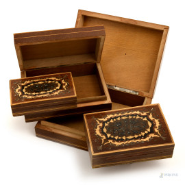 • Lot n° 0820 Serie di quattro scatole ad incastro con decorazione a finto intarsio al coperchio, XX secolo, misura massima cm 5x13x17, (difetti)