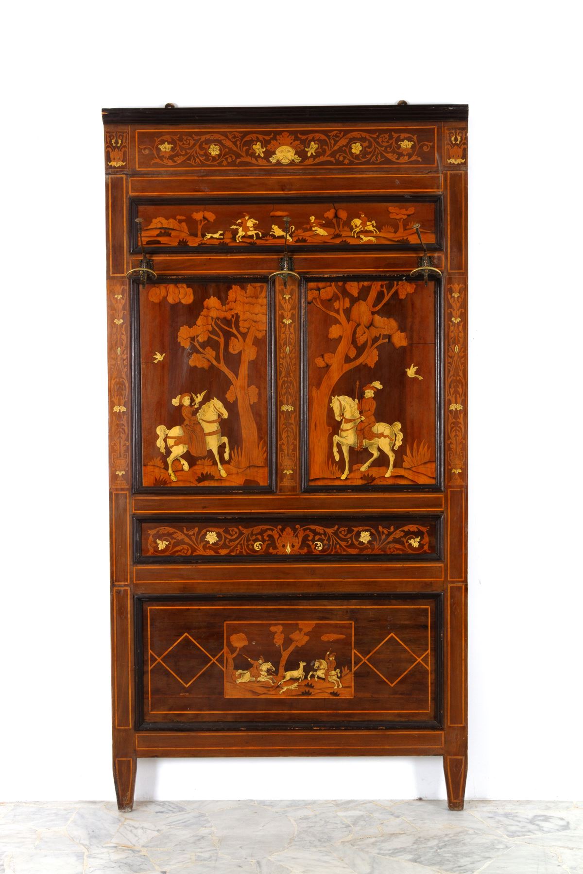 Appendiabiti da muro - Appendiabiti da muro in stile Luigi XVI intarsiato in legni vari con applicazioni in metallo dorato. Fine XIX-inizi XX secolo. Difetti. - 215x111 cm ca. -