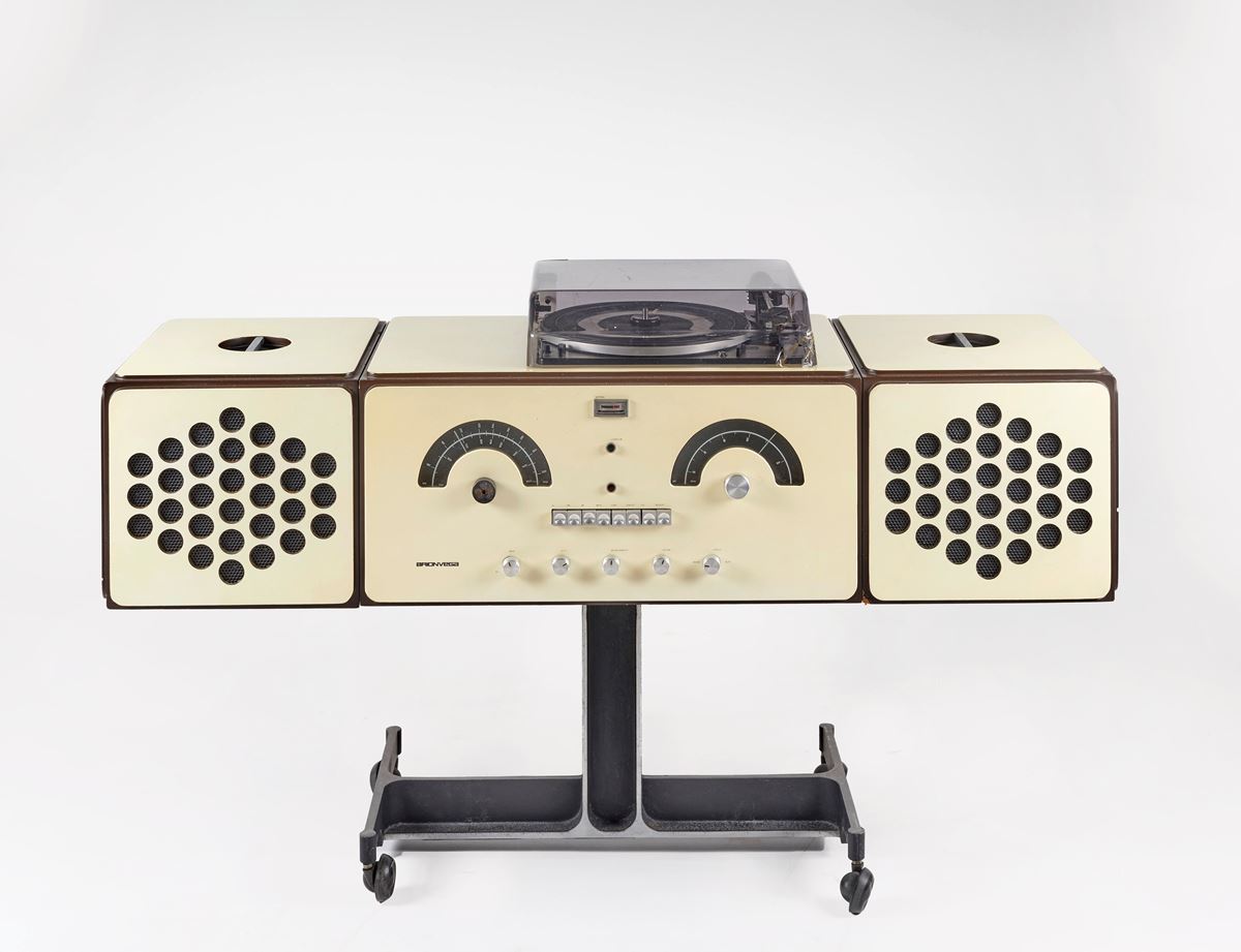 • Lot n° 0028 Radiofonografo RR126 fo-st - ACHILLE & PIER GIACOMO CASTIGLIONI Radiofonografo giradischi mod. "RR126 fo-st". Corpo in legno bianco su base in alluminio dotata di ruote. Sopra monta un giradischi Dual. Prod, Brionvega, Italia, c. 1965. Cm 74x120x37. (difetti) Bibliografia: Domus 442, settembre 1966, p. 31. - Cm 74x120x37 -