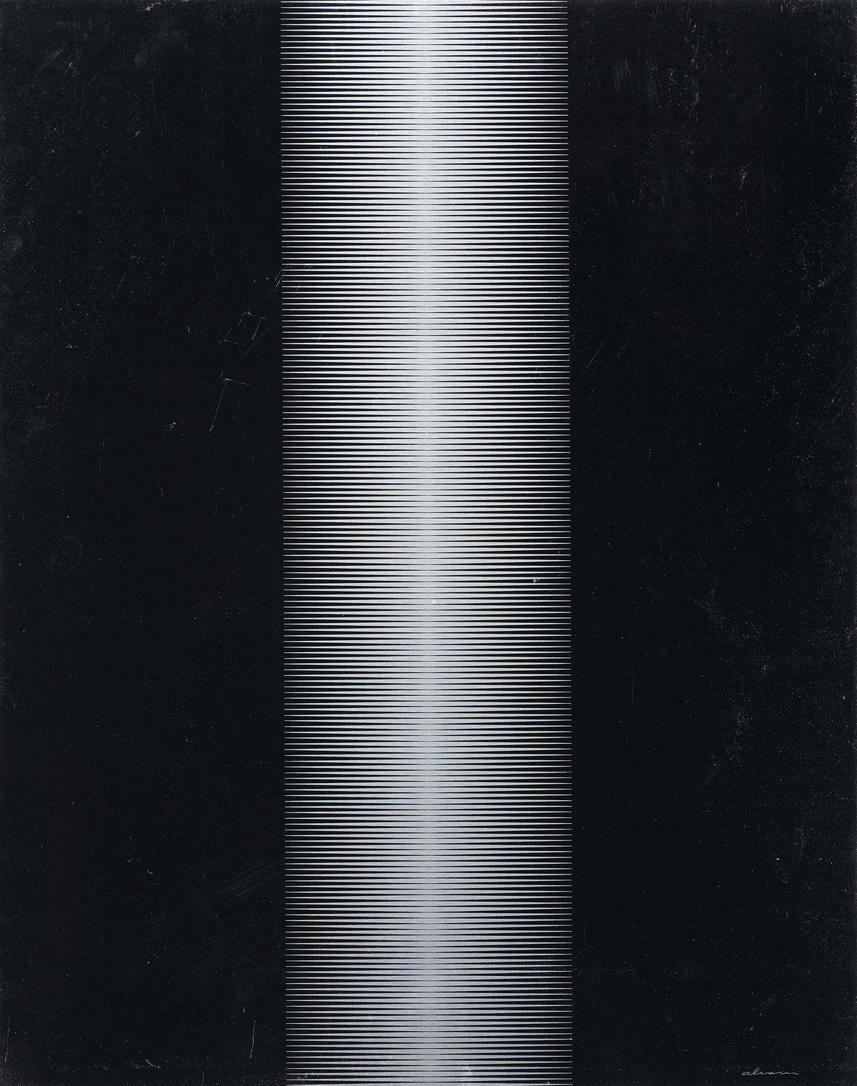 • Lot n° 0526 Testura in nero - Firma in basso a destra: Alviani. Al verso: etichetta Centro Studi / Archivio e Ricerche / Getulio Alviani, con dati dell'opera: etichetta con dati dell'opera. - cm 70,5x55,2 - Lamiera serigrafata e plastificata, multiplo, es. 86/100