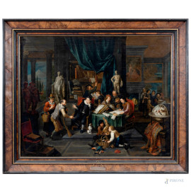 Attribuito a Balthasaar van den Bossche (1681-1715), L'Accademia, olio su tela, cm 70x85, entro cornice. Iscrizione di precedente proprietaria datata "April 1870" al retro della tela