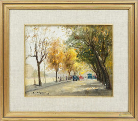 • Lot n° 0204 Guido Odierna (1913-1991), Viale alberato, olio su compensato, firmato e datato "Roma 1968" in basso a destra, entro cornice