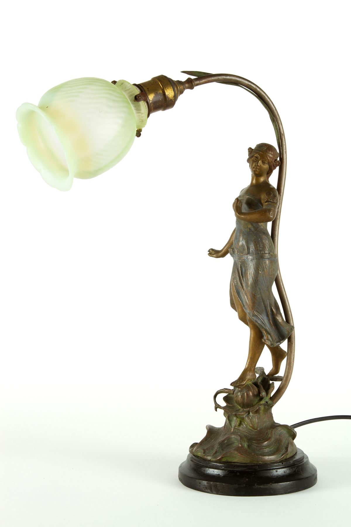 • Lot n° 0207 Lampada in antimonio - Lampada da tavolo in antimonio con figura femminile e paralume in vetro. Base in legno. XX secolo. Lievi difetti. - Alt. 47 cm ca. -