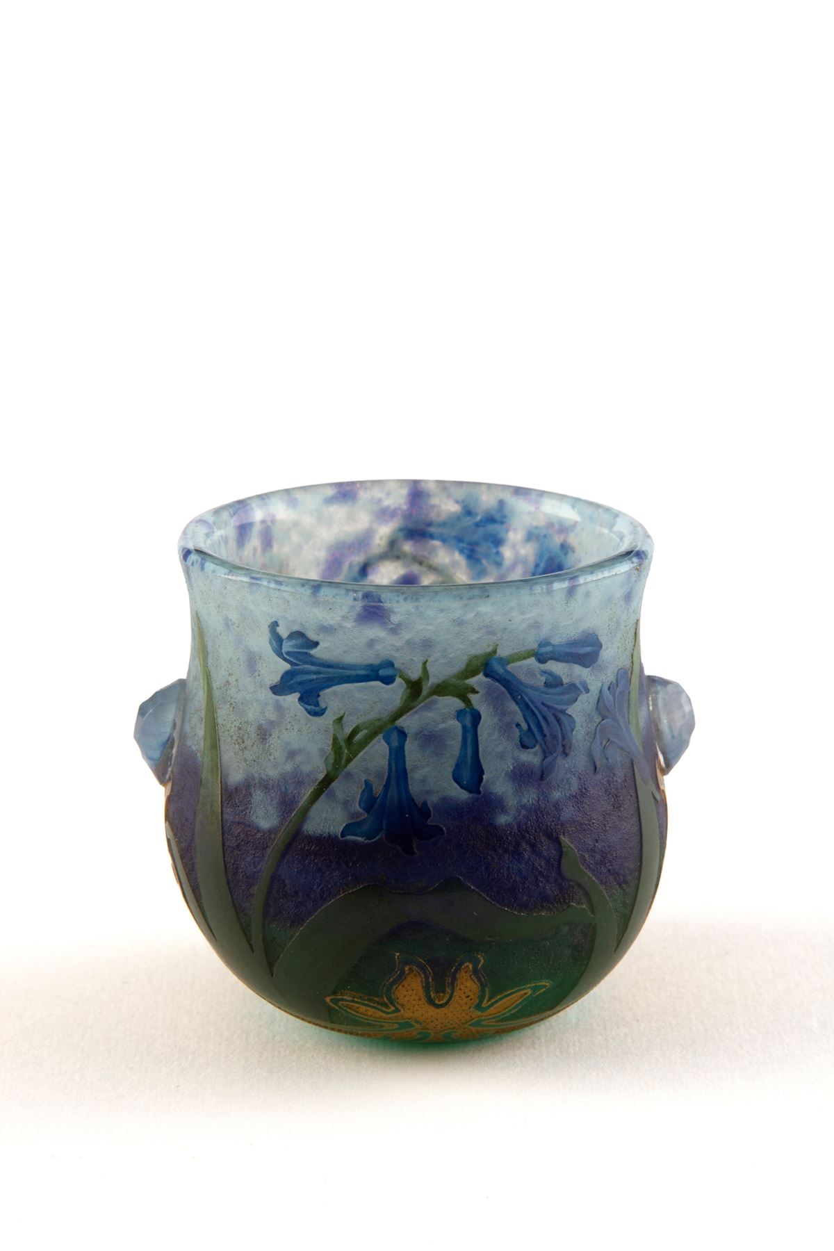Vasetto in vetro. DAUM, Nancy - Vasetto in vetro nei torni del verde e del blu, lumeggiato in oro zecchino con decoro floreale. Manifattura DAUM, Nancy. Firmato sul fondo. - 6x7 cm ca. -