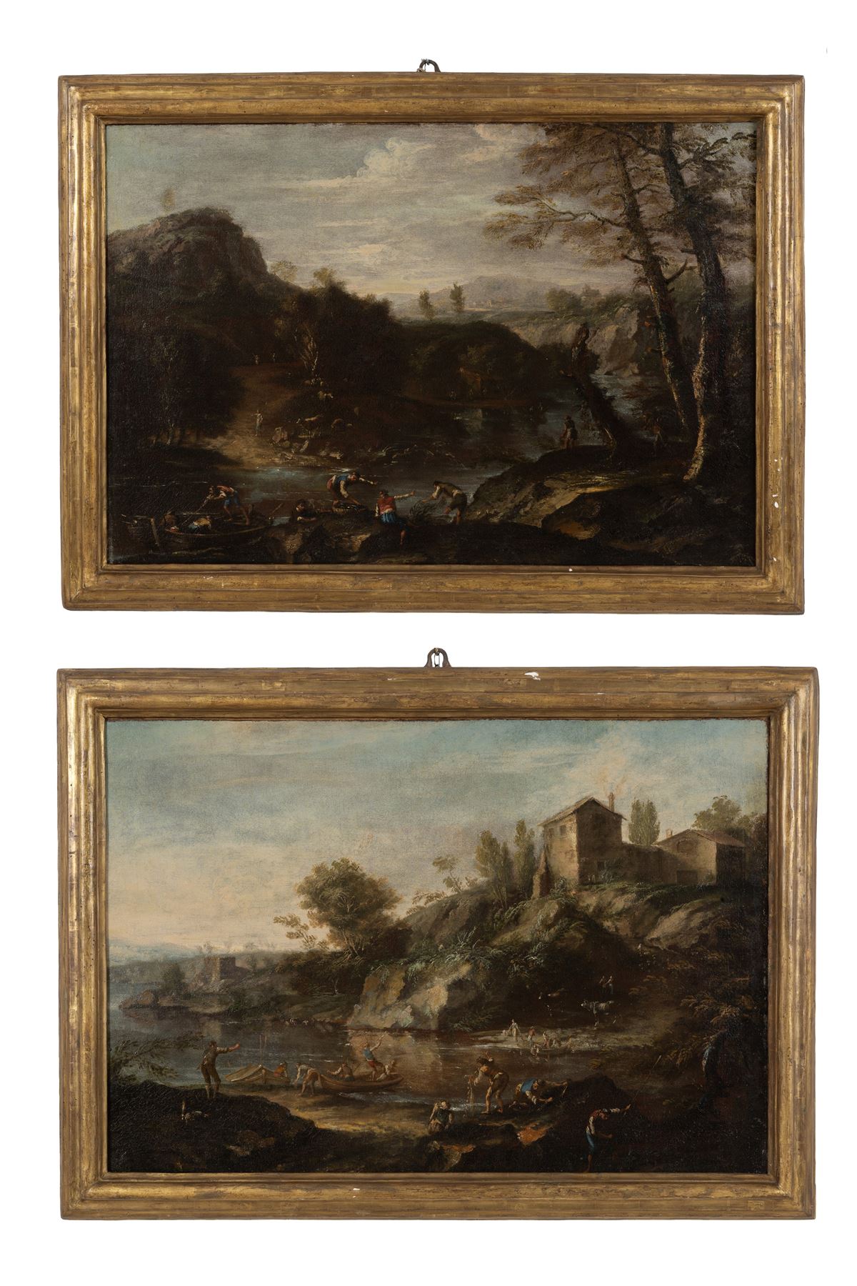 • Lot n° 0318 Coppia di dipinti "PAESAGGI FLUVIALI CON PESCATORI" - Coppia di dipinti olio su tela raffiguranti "PAESAGGI FLUVIALI CON PESCATORI". In cornici dorate. Con due expertise di Enos Malagutti, Milano, febbraio 1984. - 63x92 cm ca. -