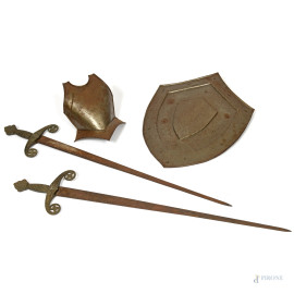 • Lot n° 0084 Lotto composto da pettorale, scudo e modelli di spade in metallo, XX secolo, misura massima cm 107,5x47, (segni del tempo)