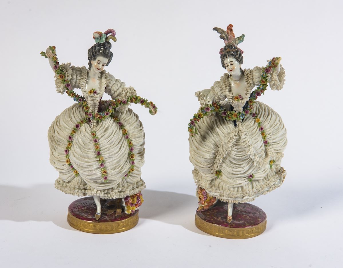 • Lot n° 0123 Ludwigsburg - Due sculture - Raffiguranti dame con ghirlande di fiori. Marchio blu al retro della base. - H. 30 x D. 15 cm - porcellana