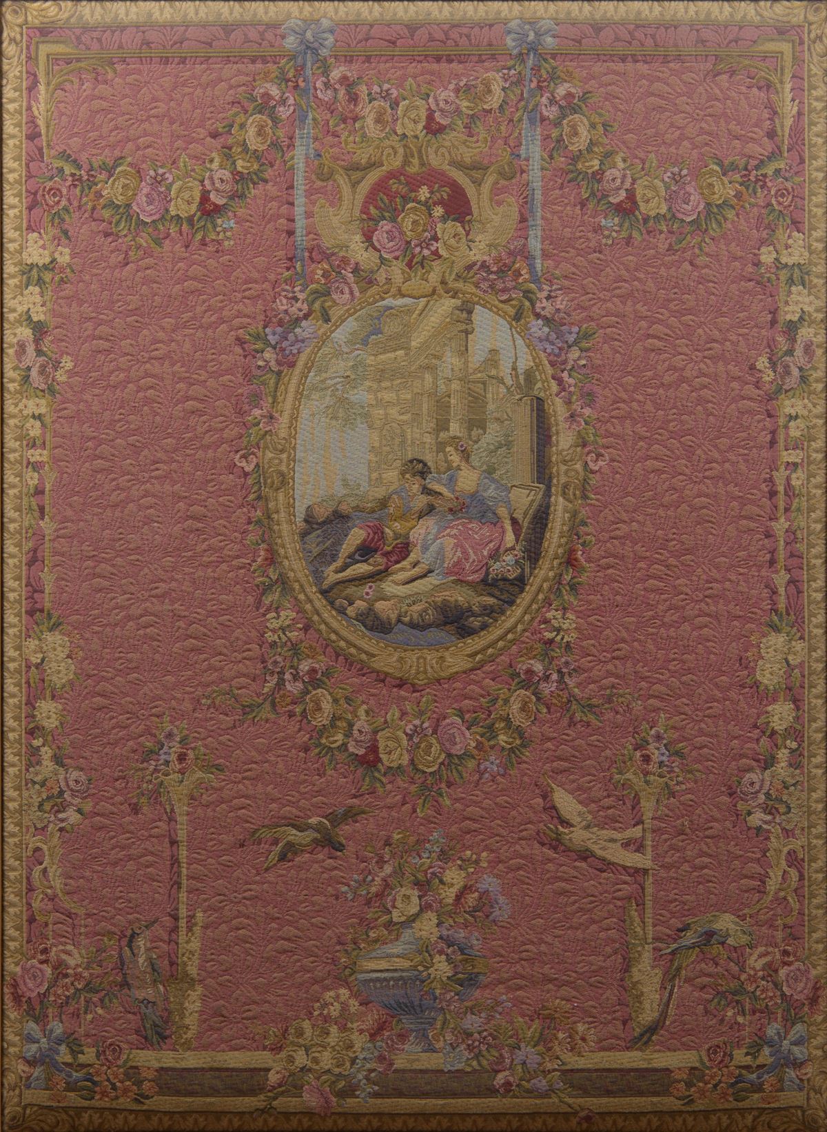 Arazzo Aubusson - con decorazioni floreali e medaglione centrale con bagnanti - 210 x 140 cm -