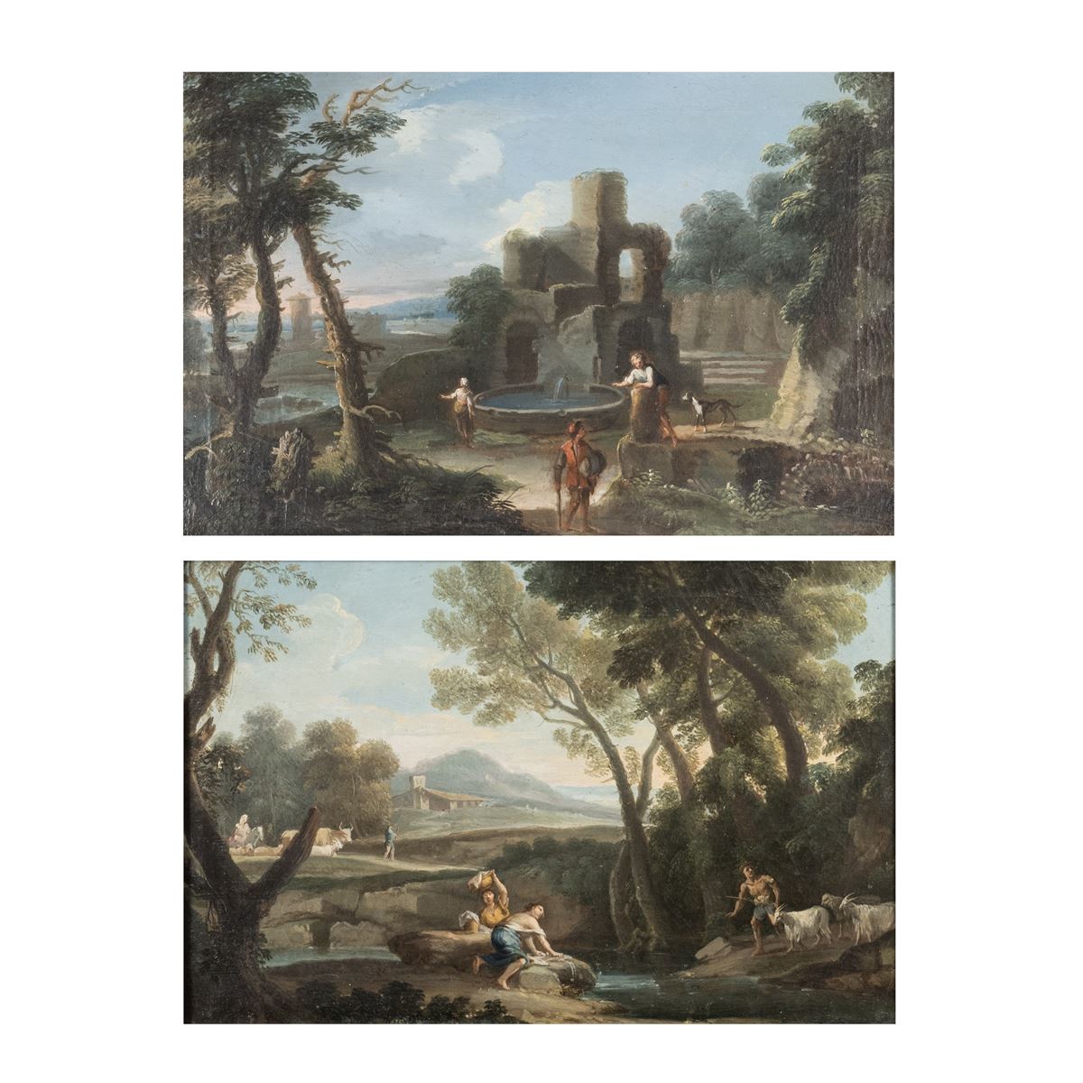Giovanni Battista Busiri - "Scene campestri con figure", coppia di oli su tela, entro cornici - 26,5x41 cm. -
