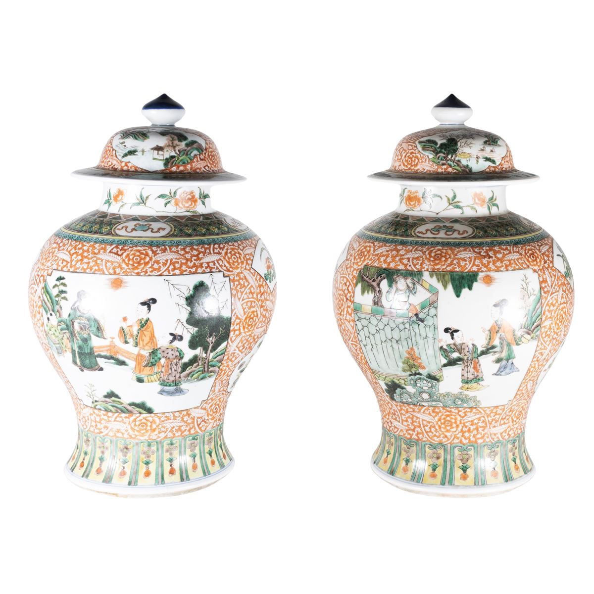 Coppia di potiches in porcellana Famiglia Verde - decorate con scene di vita di corte entro riserve, motivi floreali e motivi geometrici - 44x28 cm. -