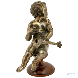 • Lot n° 0737 Scultura in metallo argentato raffigurante bambino a guisa di putto che suona uno strumento a corde. XX secolo, cm 37x27x15, (difetti)