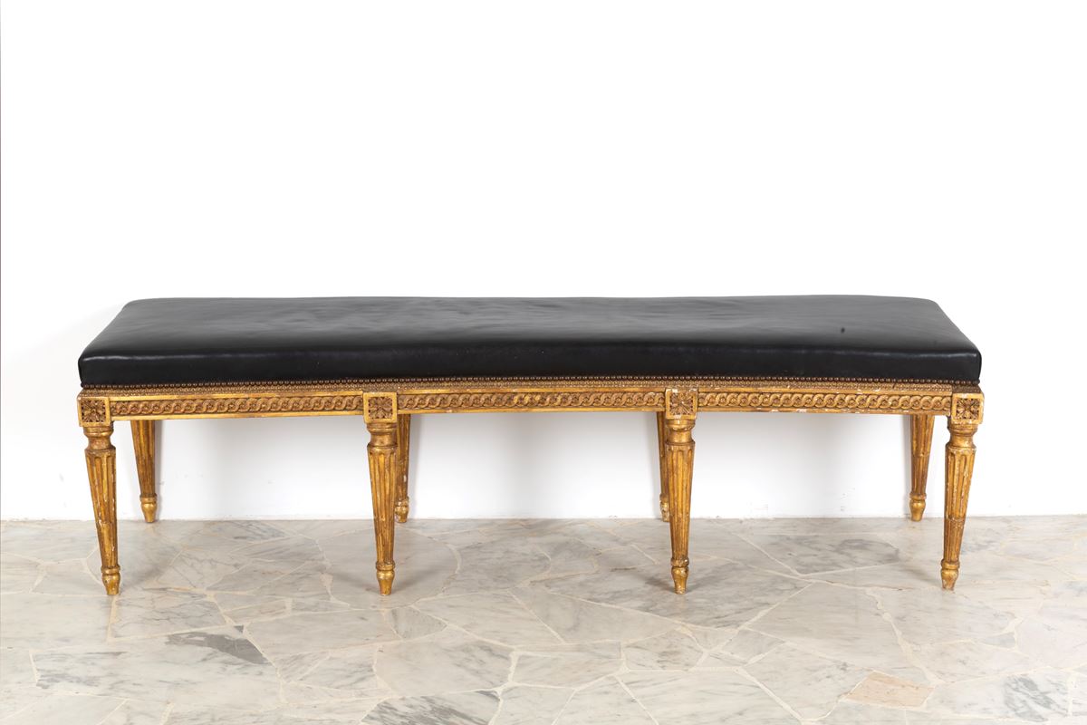 • Lot n° 0132 Panca in legno - Panca in legno intagliato e dorato rivestita con pelle nera. Periodo Luigi XVI. Difetti e mancanze sulla doratura. - 44,5x157x45 cm ca. -