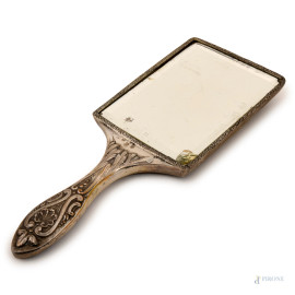 Specchio a mano rettangolare cesellato a motivi vegetali, bolli russi, XIX-XX secolo, cm 33x13, peso lordo gr. 670