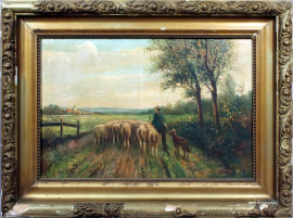 Paesaggio con pastore e gregge, olio su tela, cm. 50x80, firmato, entro cornice.