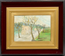 Viale alberato, olio su tavola, cm 25x35,5, XX secolo, entro cornice