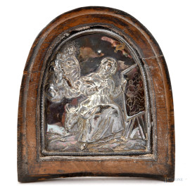 • Lot n° 0175 Placca da processione in legno e lamina in argento sbalzato raffigurante San Luca, XIX-XX secolo, cm 15x14, (usura del tempo)