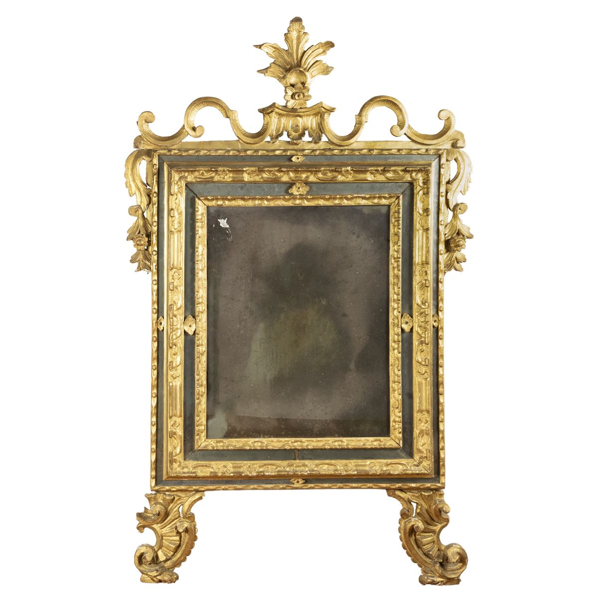 Specchiera in legno intagliato e dorato - cornice rettangolare a doppia cornice su piedi a ricciolo, decoro a motivo floreale e volute, cimasa mistilinea centrata da motivo naturalistico, usure e difetti - 138x83 cm. -