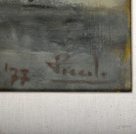 Ettore Piccolo, Tetti del Sud, olio su compensato, cm 50x60 firmnato e datato "77" in basso a destra", titolato sul retro