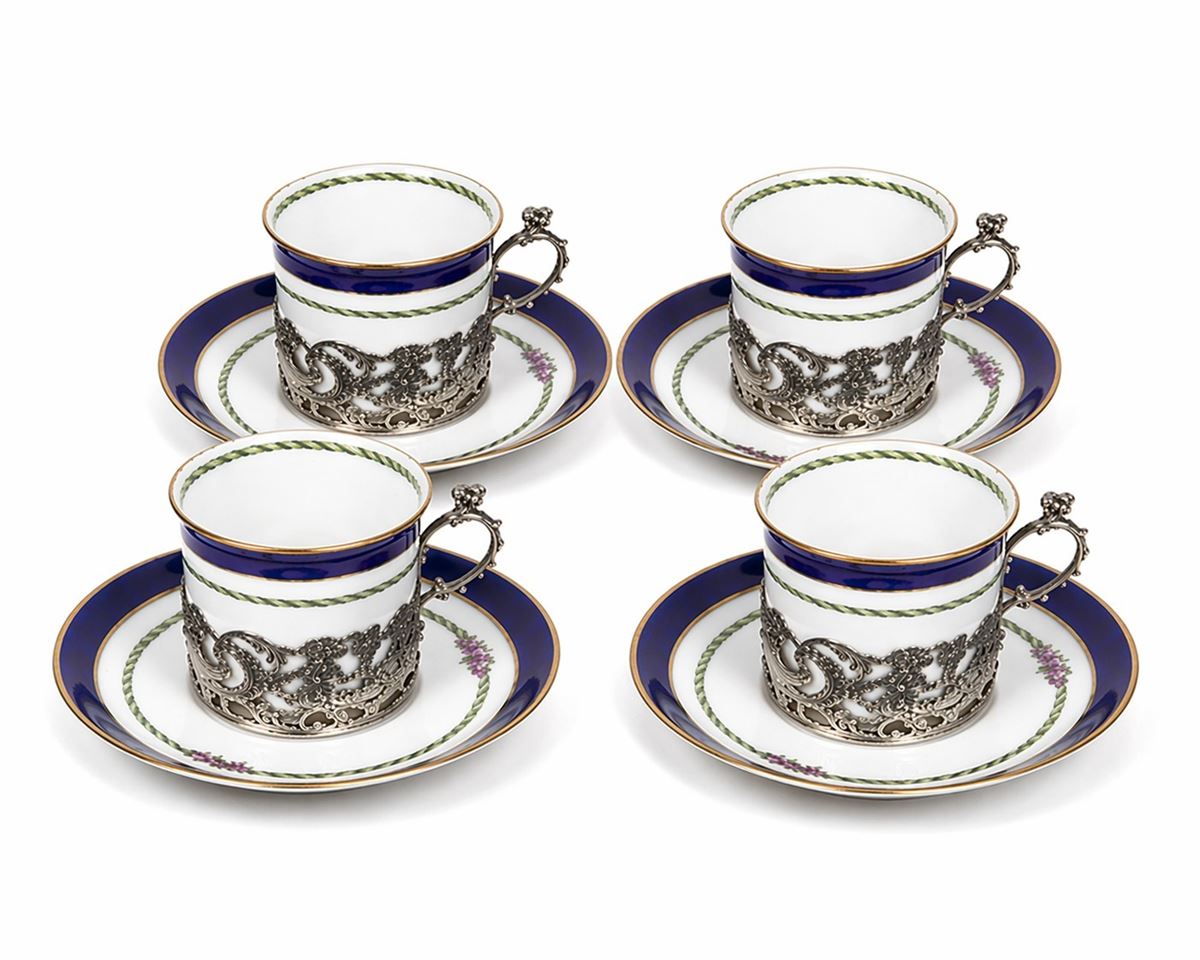 Quattro sotto tazzine in argento - Peso: 88 gr. Piattini e tazzine in porcellana inclusi nel lotto. I lotti oggetto della presente asta sono ubicati presso un’abitazione privata sita in Roma.La partecipazione all’asta implica la piena accettazione della condizione secondo cui il ritiro dei beni aggiudicati sarà interamente a cura, rischio e spese dell’aggiudicatario.Resta inteso che eventuali operazioni di smontaggio, imballaggio, trasporto e ritiro dovranno essere organizzate direttamente dall’aggiudicatario.Si raccomanda pertanto di richiedere preventivamente tutte le informazioni necessarie, anche al fine di acquisire eventuali preventivi per il trasporto prima di formulare un’offerta. - -