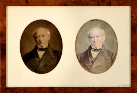 Lotto di una fotografia e una fotografia ritoccata di gentiluomo in assetto ovale entro unica cornice, XIX secolo, cm 27,5x42 compreso passepartout, (segni di usura del tempo)